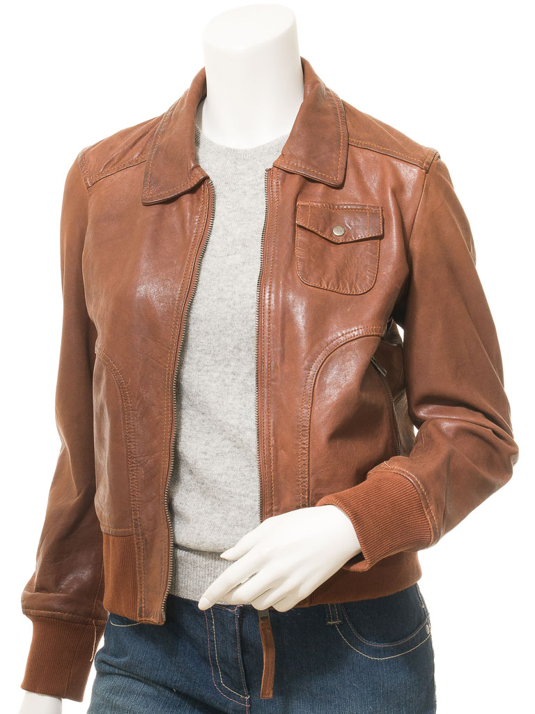 WOMEN'S TAN LEATHER BOMBER JACKET